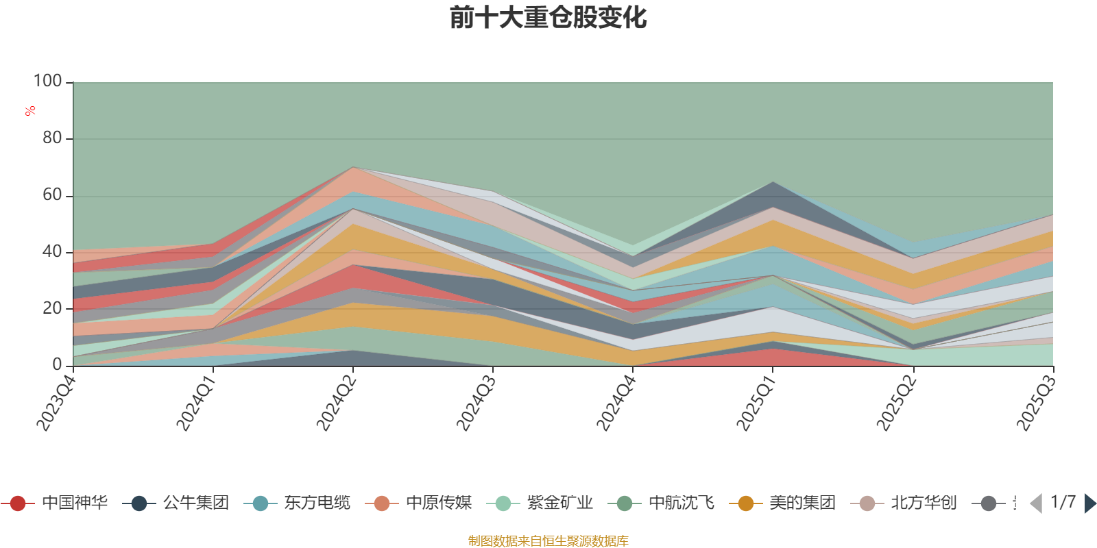截至2025年三季度末,基金十大重仓股分别是紫金矿业、伊利股份、国电南瑞、江中药业、云天化、陕西煤业、长江电力、杭州银行、燕京啤酒、北方华创。