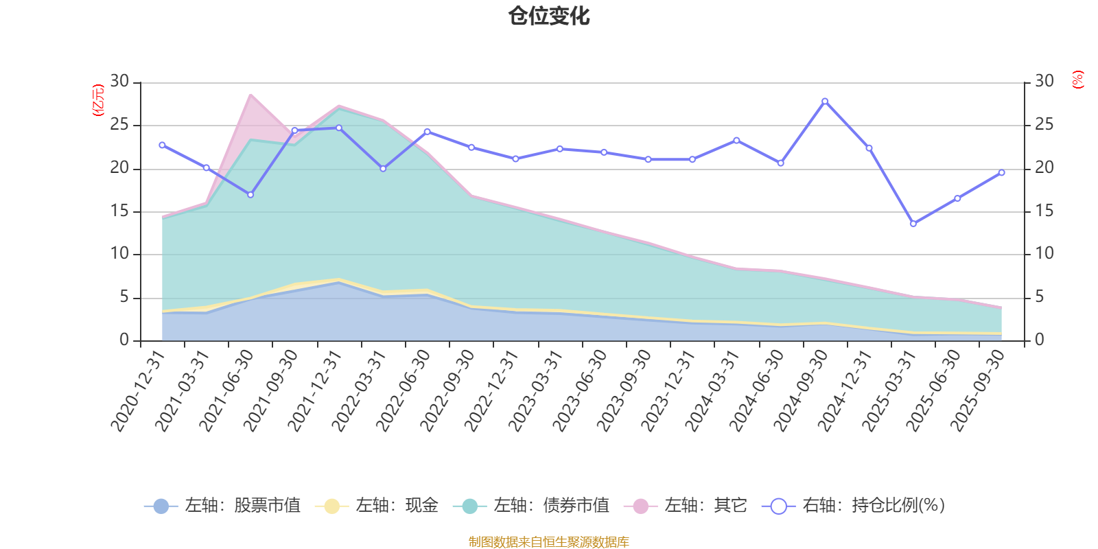 据定期报告数据统计,近三年平均股票仓位为20.93%,同类平均为19.03%。2024年三季度末基金达到27.81%的最高仓位,2025年一季度末最低,为13.59%。
