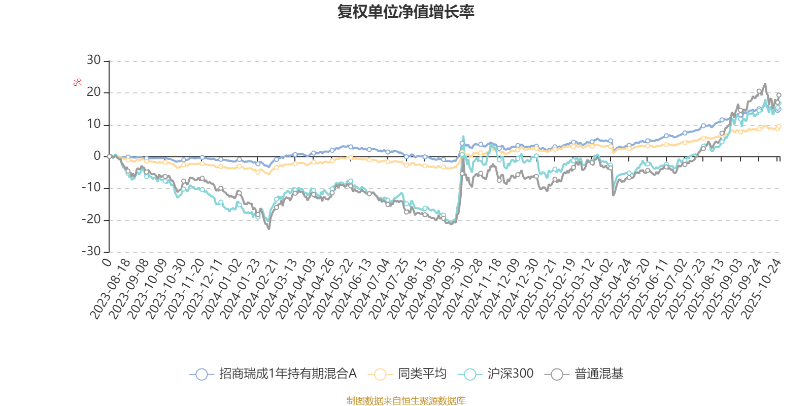截至10月24日,招商瑞成1年持有期混合A近三个月复权单位净值增长率为4.62%,位于同类可比基金112/629;近半年复权单位净值增长率为10.97%,位于同类可比基金66/629;近一年复权单位净值增长率为10.93%,位于同类可比基金113/623。