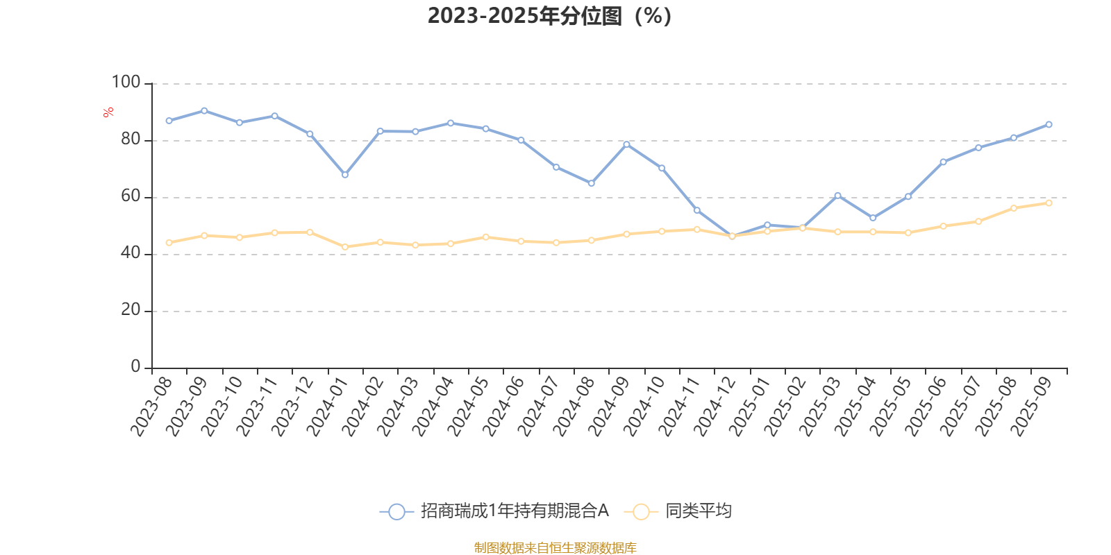 通过所选区间该基金净值增长率分位图,可以观察该基金与同类基金业绩比较情况。图为坐标原点到区间内某时点的净值增长率在同类基金中的分位数。