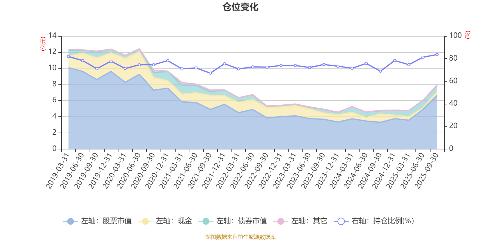 据定期报告数据统计,近三年平均股票仓位为75.15%,同类平均为72.28%。2025年三季度末基金达到83.62%的最高仓位,2021年三季度末最低,为67.13%。