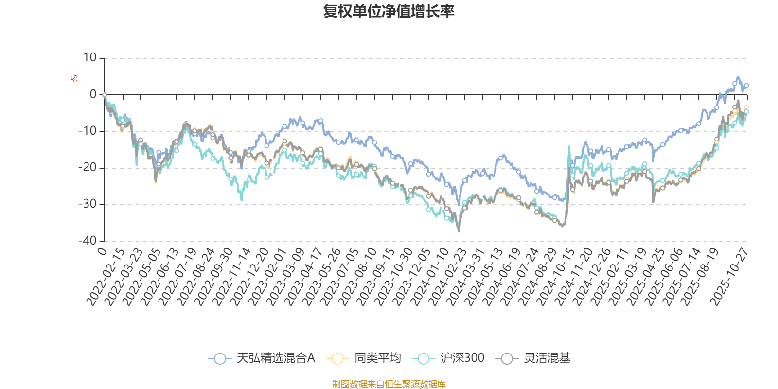截至10月27日,天弘精选混合A近三个月复权单位净值增长率为6.93%,位于同类可比基金863/1287;近半年复权单位净值增长率为18.75%,位于同类可比基金804/1287;近一年复权单位净值增长率为23.42%,位于同类可比基金607/1287;近三年复权单位净值增长率为25.67%,位于同类可比基金423/1286。