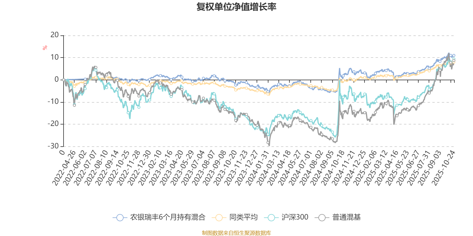 截至10月24日,农银瑞丰6个月持有混合近三个月复权单位净值增长率为4.45%,位于同类可比基金118/629;近半年复权单位净值增长率为9.02%,位于同类可比基金114/629;近一年复权单位净值增长率为8.48%,位于同类可比基金211/623;近三年复权单位净值增长率为11.41%,位于同类可比基金265/556。