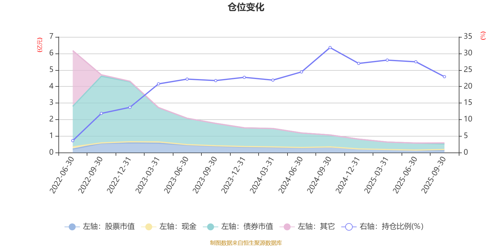 据定期报告数据统计,近三年平均股票仓位为23.74%,同类平均为19.03%。2024年三季度末基金达到31.78%的最高仓位,2022年上半年末最低,为3.63%。