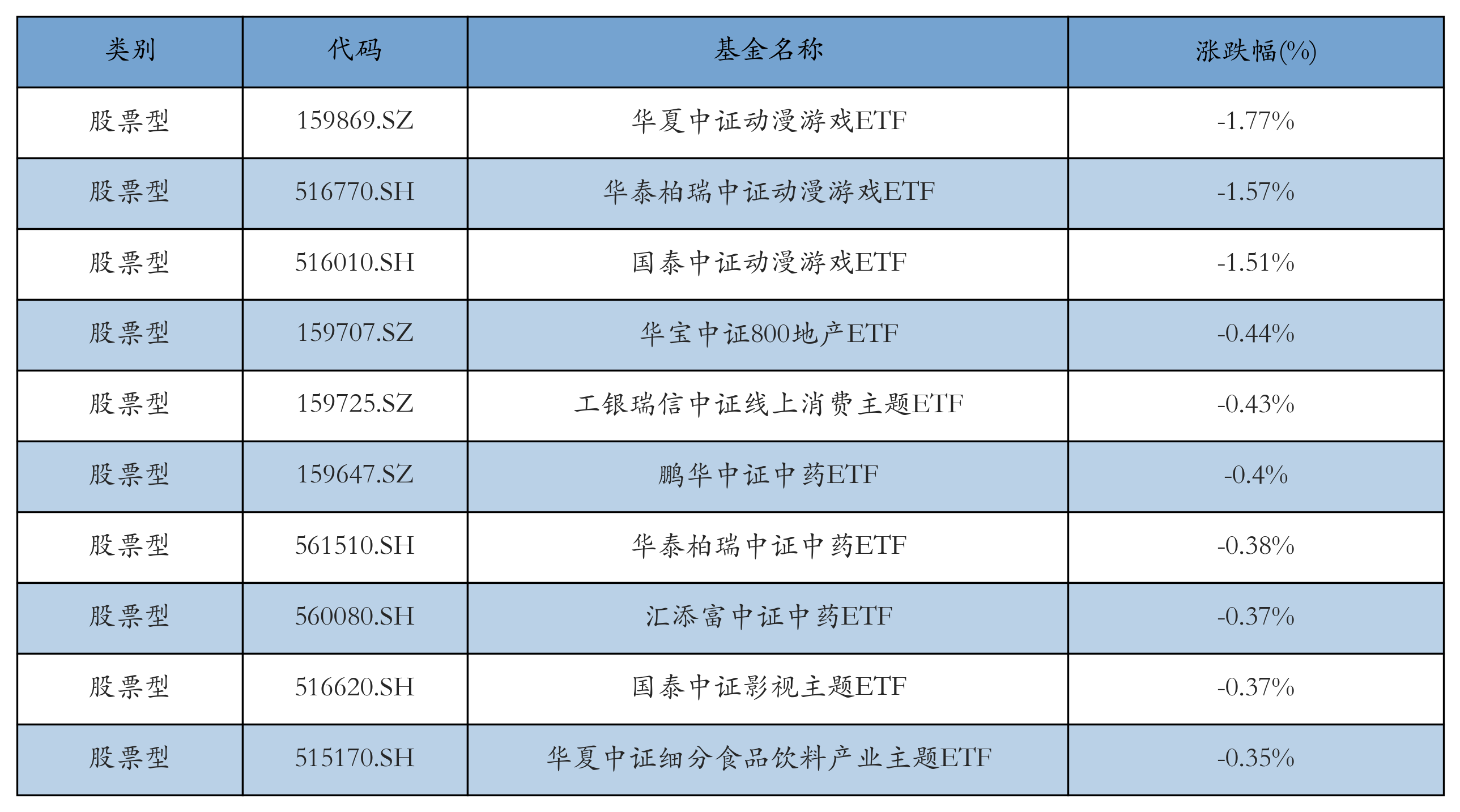 昨日股票型ETF跌幅最大的3只ETF及其收益率分别为:华夏中证动漫游戏ETF(-1.77%)、华泰柏瑞中证动漫游戏ETF(-1.57%)、国泰中证动漫游戏ETF(-1.51%)。跌幅前10详情见下表: