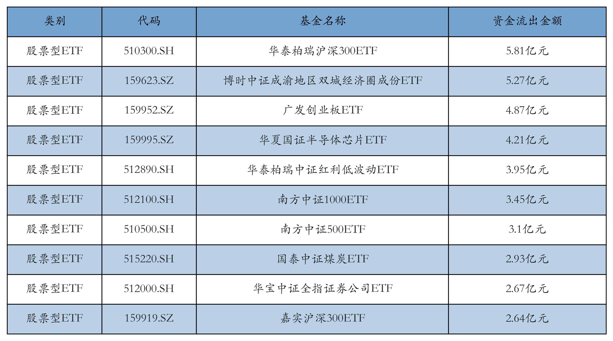 昨日股票型ETF资金流出最多的3只ETF及其流出金额分别为:华泰柏瑞沪深300ETF(流出5.81亿元)、博时中证成渝地区双城经济圈成份ETF(流出5.27亿元)、广发创业板ETF(流出4.87亿元)。资金流出前10详情见下表: