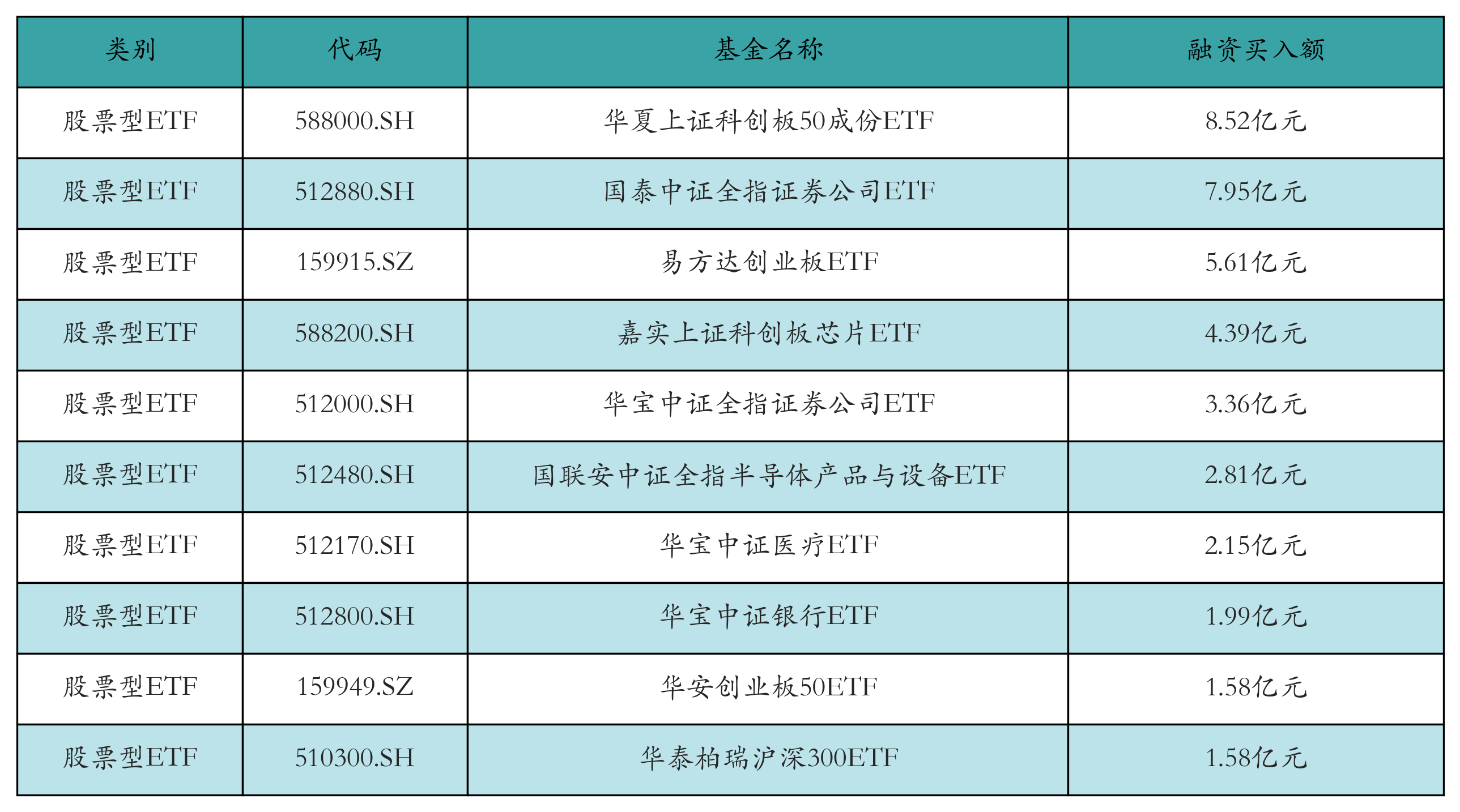 昨日股票型ETF融资买入额最高的3只ETF及其买入金额分别为:华夏上证科创板50成份ETF(8.52亿元)、国泰中证全指证券公司ETF(7.95亿元)、易方达创业板ETF(5.61亿元)。融资买入额前10详情见下表: