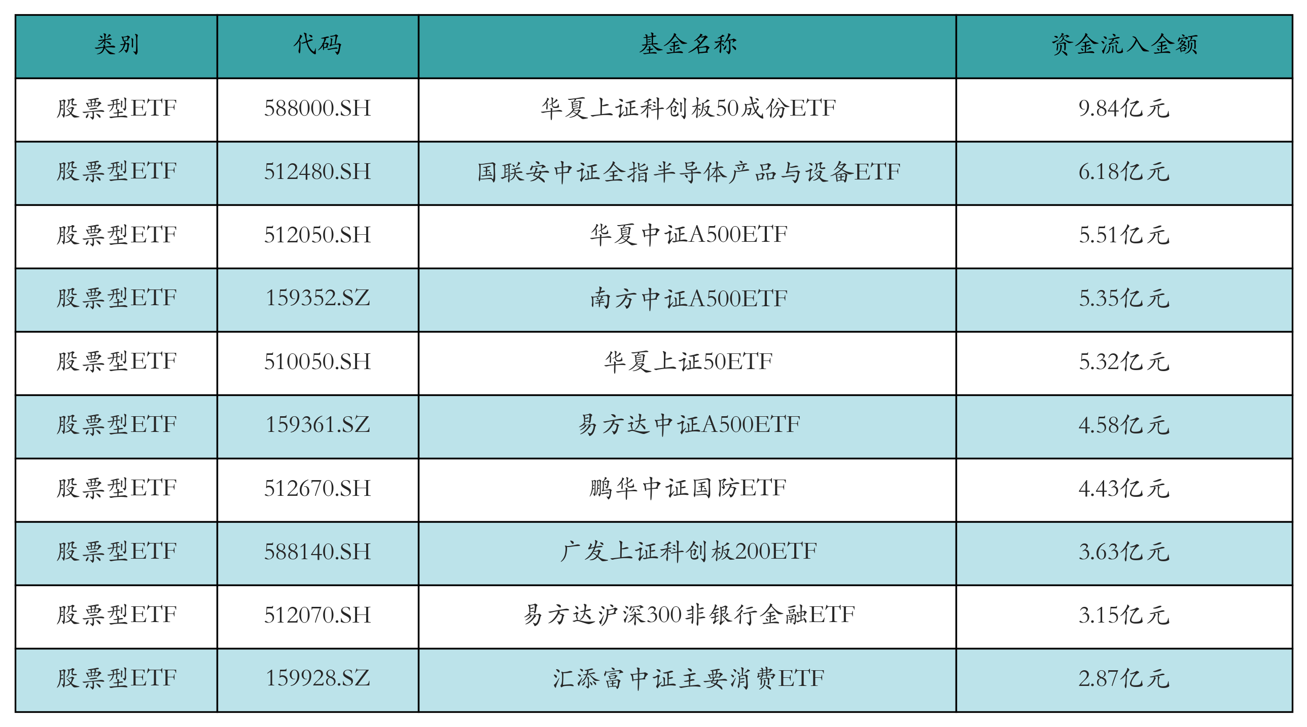 昨日股票型ETF资金流入最多的3只ETF及其流入金额分别为:华夏上证科创板50成份ETF(流入9.84亿元)、国联安中证全指半导体产品与设备ETF(流入6.18亿元)、华夏中证A500ETF(流入5.51亿元)。资金流入前10详情见下表: