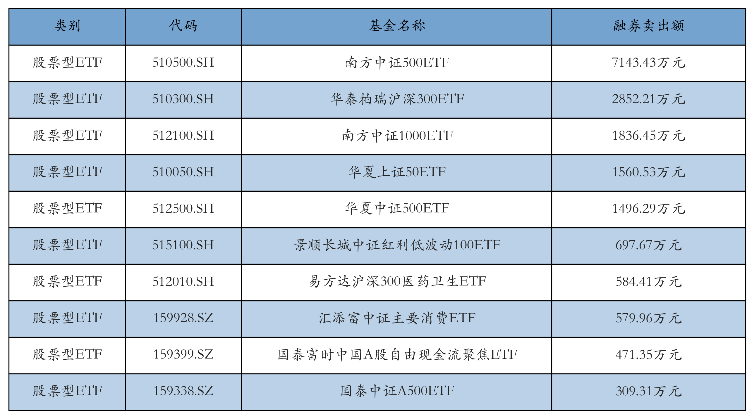 昨日股票型ETF融资卖出额最高的3只ETF及其卖出金额分别为:南方中证500ETF(7143.43万元)、华泰柏瑞沪深300ETF(2852.21万元)、南方中证1000ETF(1836.45万元)。融券卖出额前10详情见下表: