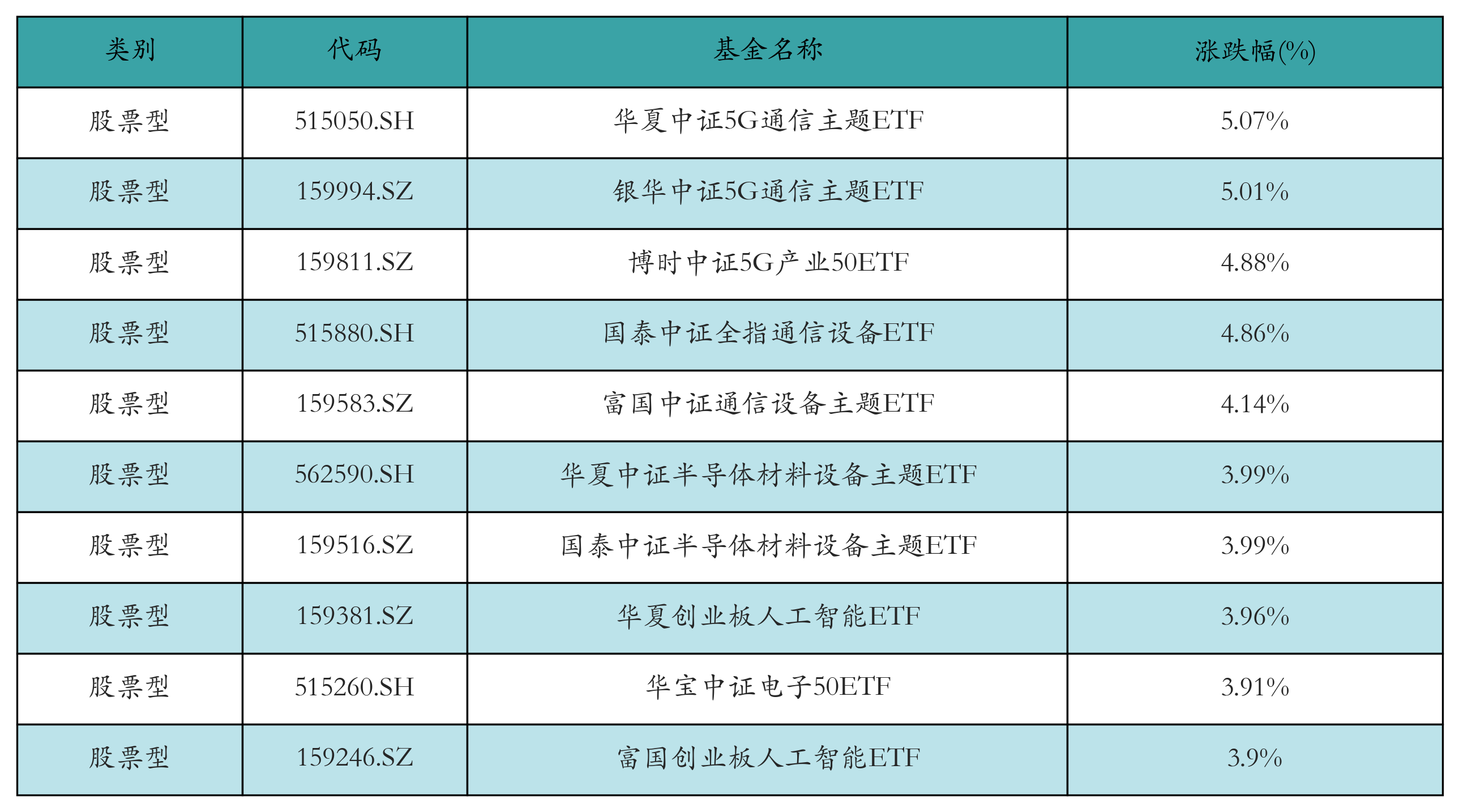 昨日股票型ETF涨幅最高的3只ETF及其收益率分别为:华夏中证5G通信主题ETF(5.07%)、银华中证5G通信主题ETF(5.01%)、博时中证5G产业50ETF(4.88%)。涨幅前10详情见下表: