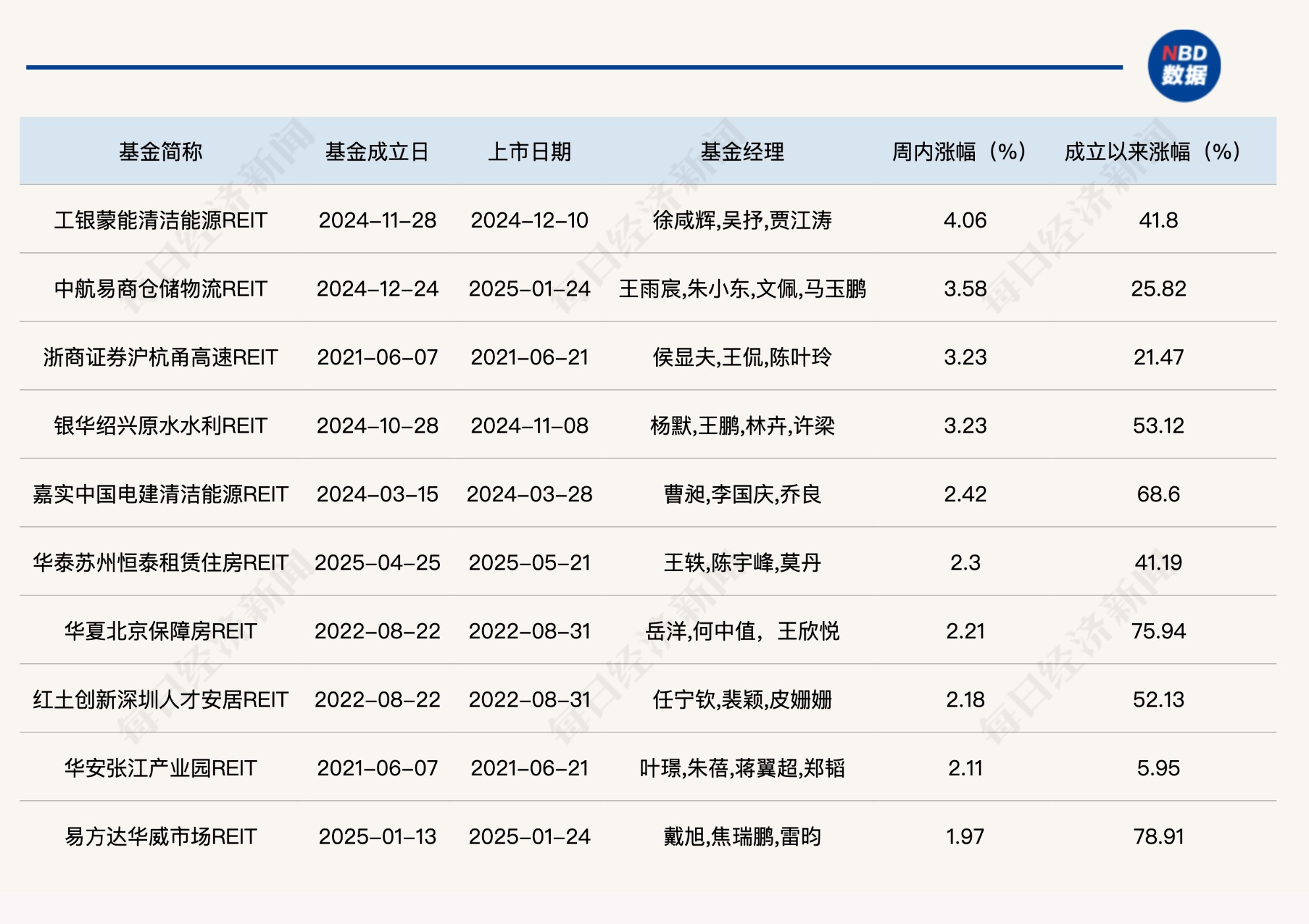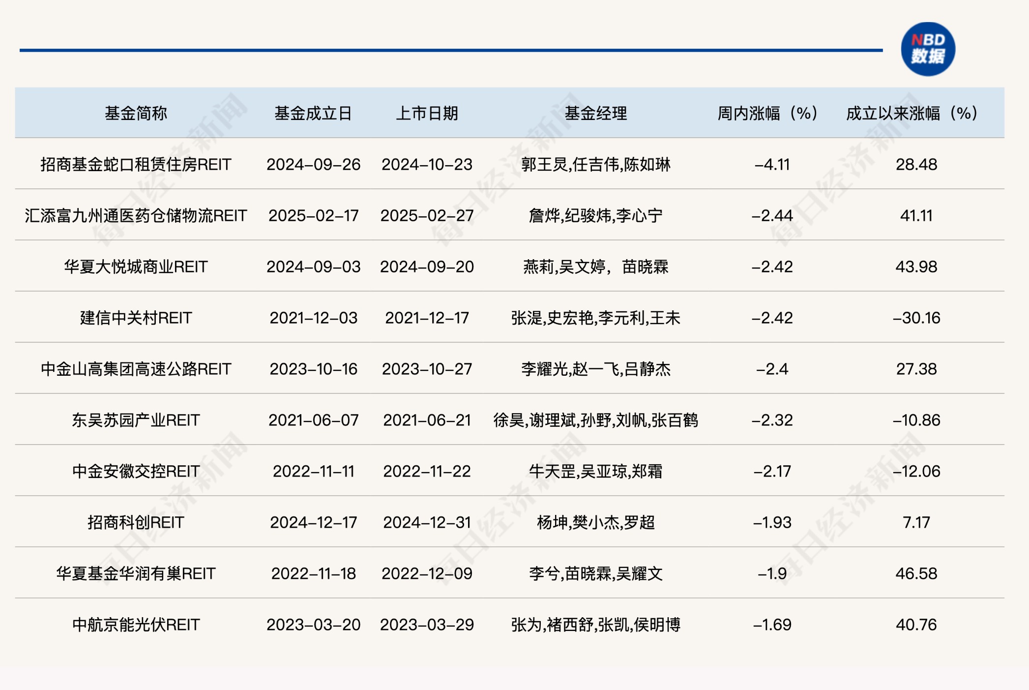 环比下跌的产品则减少至28只,还有一只产品表现持平。跌幅最大的三只分别为招商基金蛇口租赁住房REIT、汇添富九州通医药仓储物流REIT和华夏大悦城商业REIT,周内分别下跌了4.11%、2.44%和2.42%。