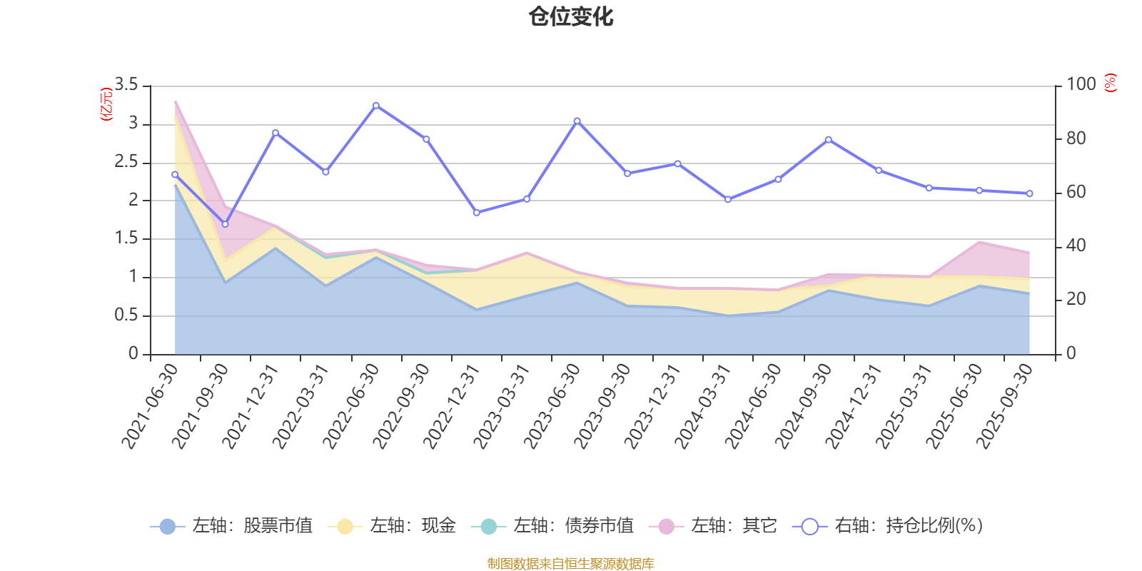 据定期报告数据统计,近三年平均股票仓位为65.81%,同类平均为72.35%。2022年上半年末基金达到92.6%的最高仓位,2021年三季度末最低,为48.44%。