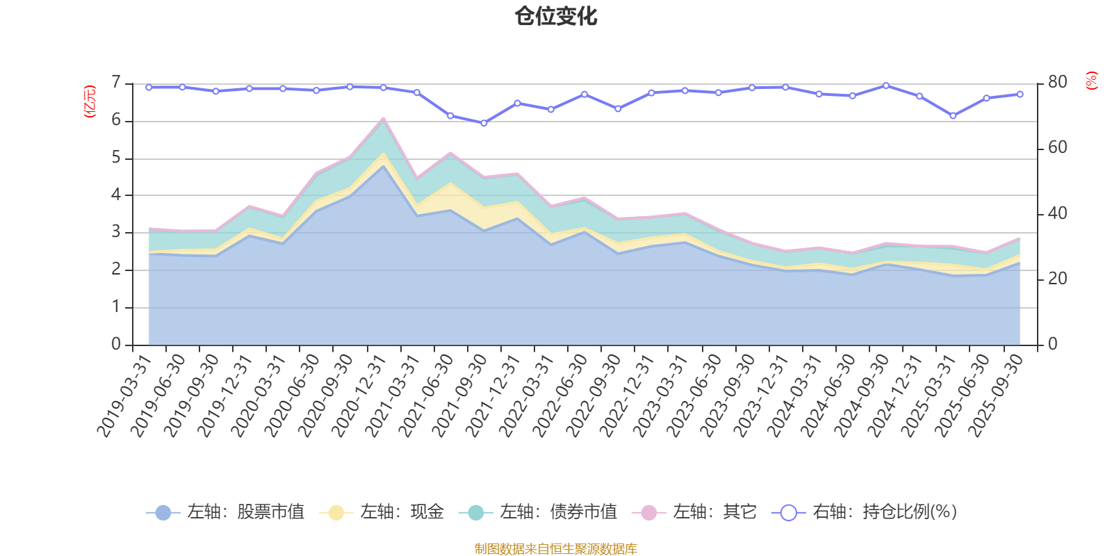 据定期报告数据统计,近三年平均股票仓位为76.7%,同类平均为72.16%。2024年三季度末基金达到79.34%的最高仓位,2021年三季度末最低,为67.87%。