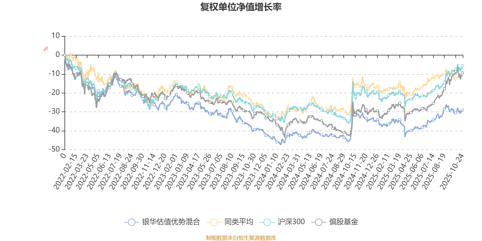 截至10月24日,银华估值优势混合近三个月复权单位净值增长率为4.13%,位于同类可比基金3/16;近半年复权单位净值增长率为17.93%,位于同类可比基金4/16;近一年复权单位净值增长率为3.81%,位于同类可比基金11/14;近三年复权单位净值增长率为-3.46%,位于同类可比基金11/12。