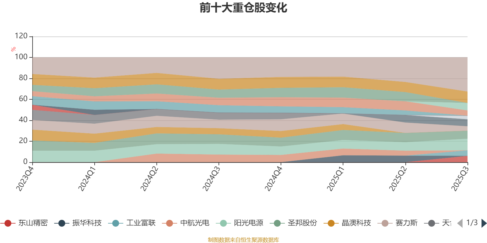 该基金持股集中度较高,且持股标的较为稳定,近2年前十大重仓股集中度长期超过60%。截至2025年三季度末,基金十大重仓股分别是阳光电源、亿纬锂能、圣邦股份、寒武纪、分众传媒、东山精密、工业富联、中微公司、赛力斯、药明康德。