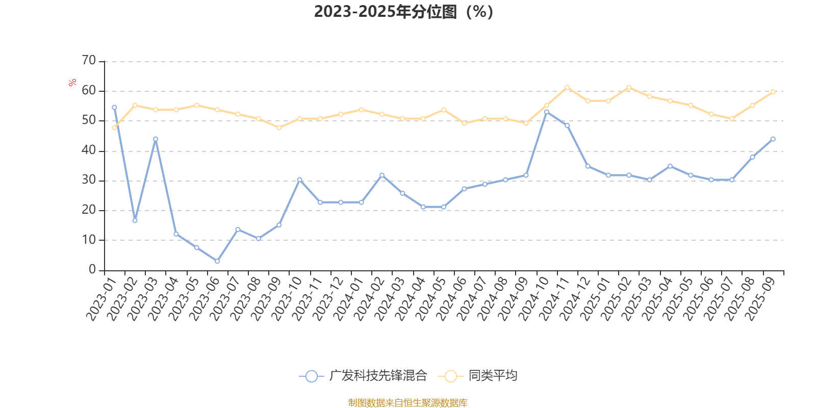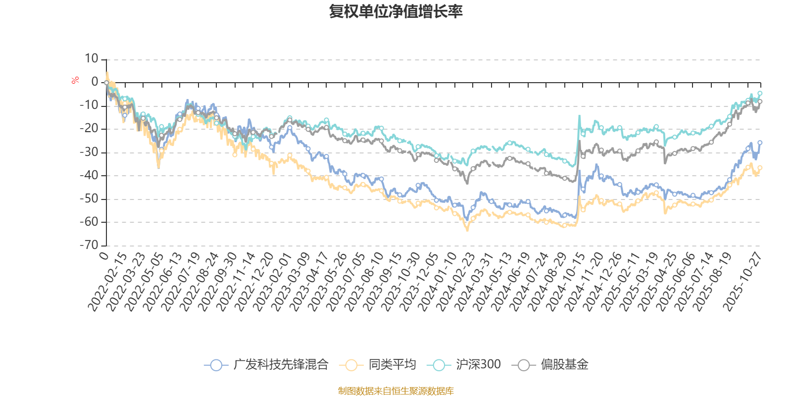 截至10月27日,广发科技先锋混合近三个月复权单位净值增长率为36.11%,位于同类可比基金9/100;近半年复权单位净值增长率为42.48%,位于同类可比基金23/99;近一年复权单位净值增长率为23.55%,位于同类可比基金51/90;近三年复权单位净值增长率为-7.55%,位于同类可比基金33/62。