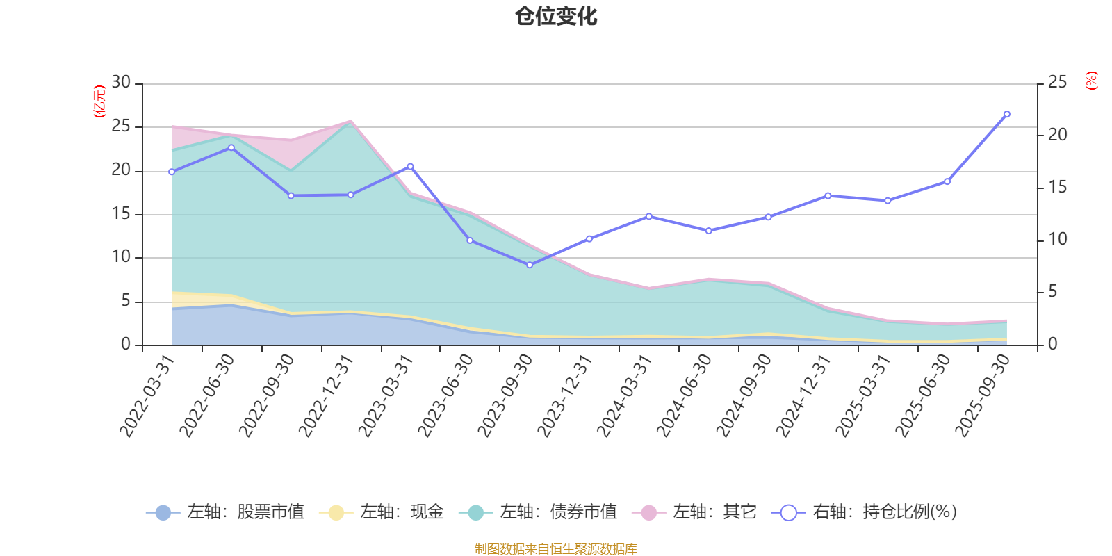 据定期报告数据统计,近三年平均股票仓位为13.37%,同类平均为19.14%。2025年三季度末基金达到22.07%的最高仓位,2023年三季度末最低,为7.65%。