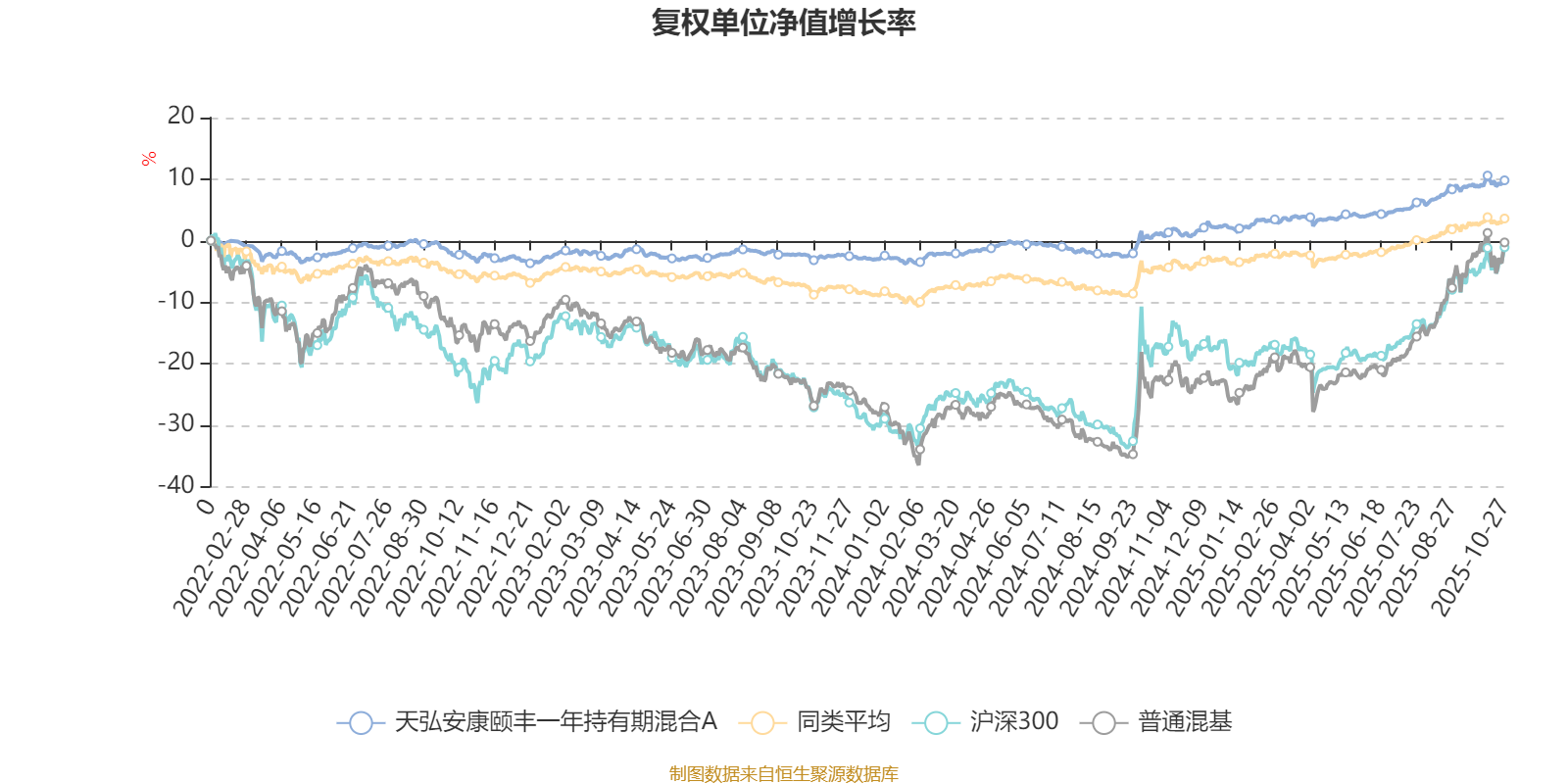 截至10月27日,天弘安康颐丰一年持有期混合A近三个月复权单位净值增长率为3.11%,位于同类可比基金253/629;近半年复权单位净值增长率为5.94%,位于同类可比基金277/629;近一年复权单位净值增长率为8.55%,位于同类可比基金217/623;近三年复权单位净值增长率为13.04%,位于同类可比基金228/557。