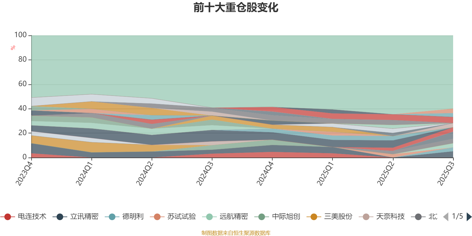 截至2025年三季度末,基金十大重仓股分别是精智达、立讯精密、华勤技术、新宙邦、北方华创、科达利、新雷能、远航精密、兆易创新、德明利。