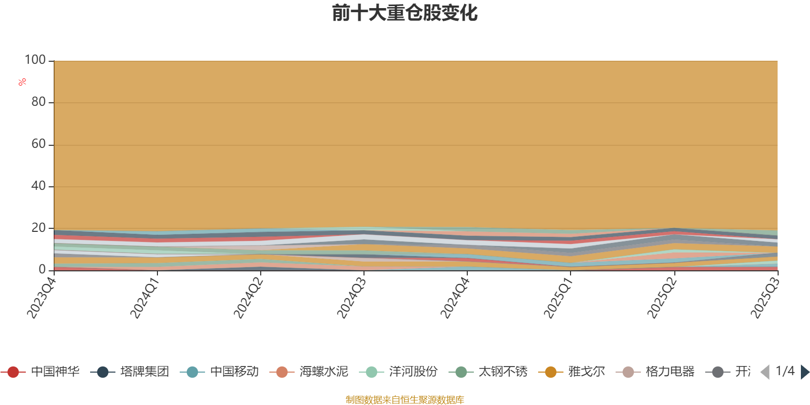 截至2025年三季度末,基金十大重仓股分别是冀中能源、养元饮品、雅戈尔、厦门国贸、双汇发展、苏泊尔、中国神华、大秦铁路、洋河股份、中国移动。