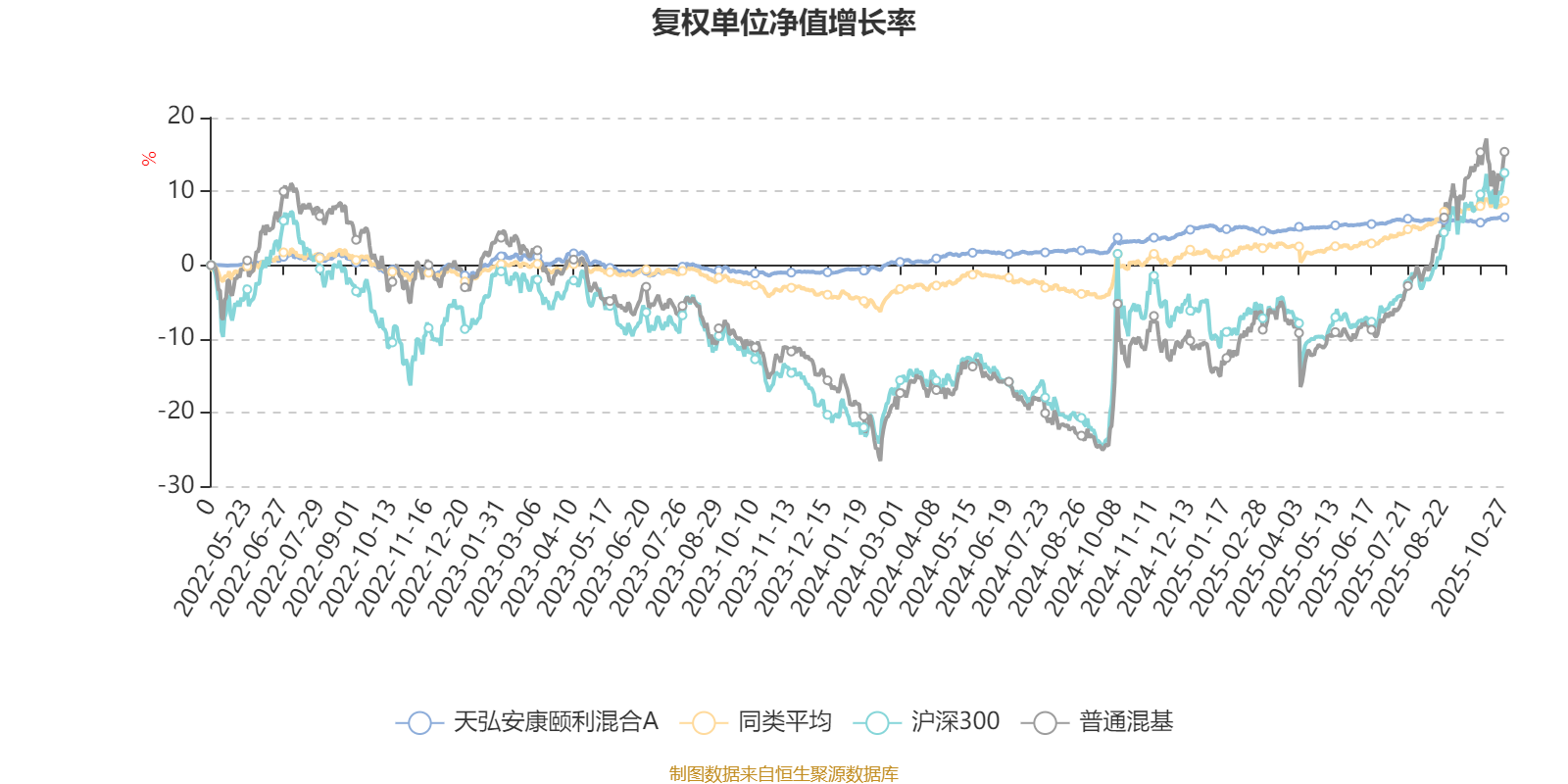 截至10月27日,天弘安康颐利混合A近三个月复权单位净值增长率为0.37%,位于同类可比基金578/629;近半年复权单位净值增长率为1.30%,位于同类可比基金598/629;近一年复权单位净值增长率为3.17%,位于同类可比基金567/623;近三年复权单位净值增长率为7.73%,位于同类可比基金406/557。
