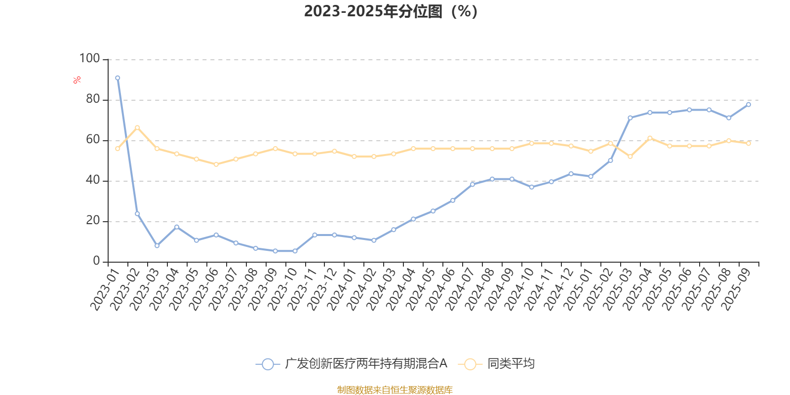 通过所选区间该基金净值增长率分位图,可以观察该基金与同类基金业绩比较情况。图为坐标原点到区间内某时点的净值增长率在同类基金中的分位数。