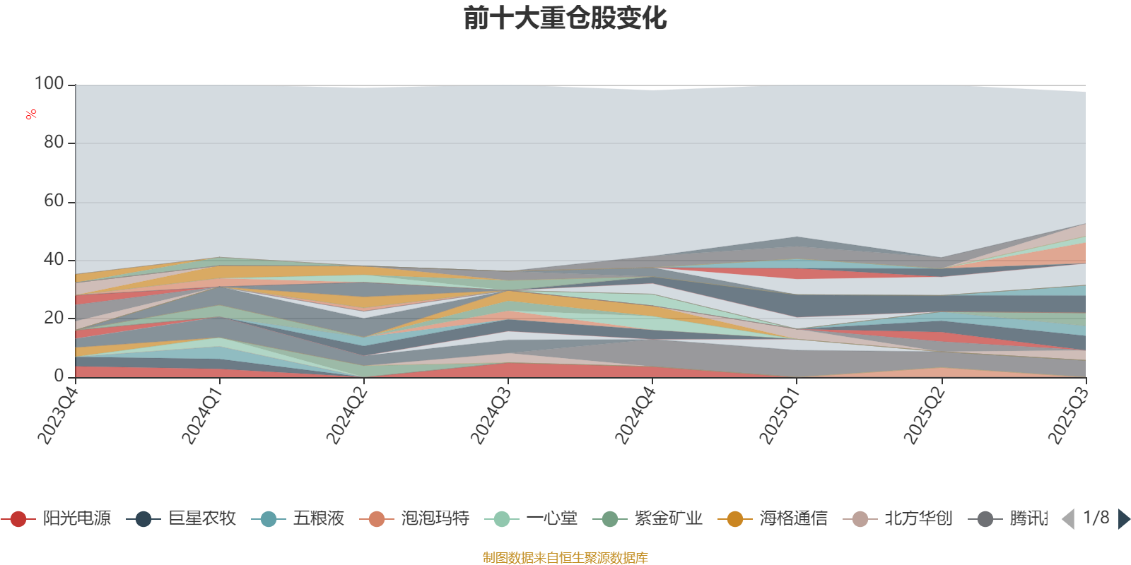 据定期报告数据统计,近三年平均股票仓位为50.18%,同类平均为67.37%。2025年三季度末基金达到62.89%的最高仓位,2021年三季度末最低,为22.19%。