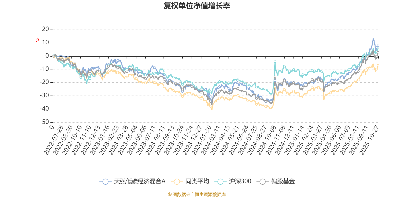 截至10月27日,天弘低碳经济混合A近三个月复权单位净值增长率为19.41%,位于同类可比基金225/689;近半年复权单位净值增长率为33.98%,位于同类可比基金238/688;近一年复权单位净值增长率为36.97%,位于同类可比基金193/653;近三年复权单位净值增长率为21.48%,位于同类可比基金142/364。