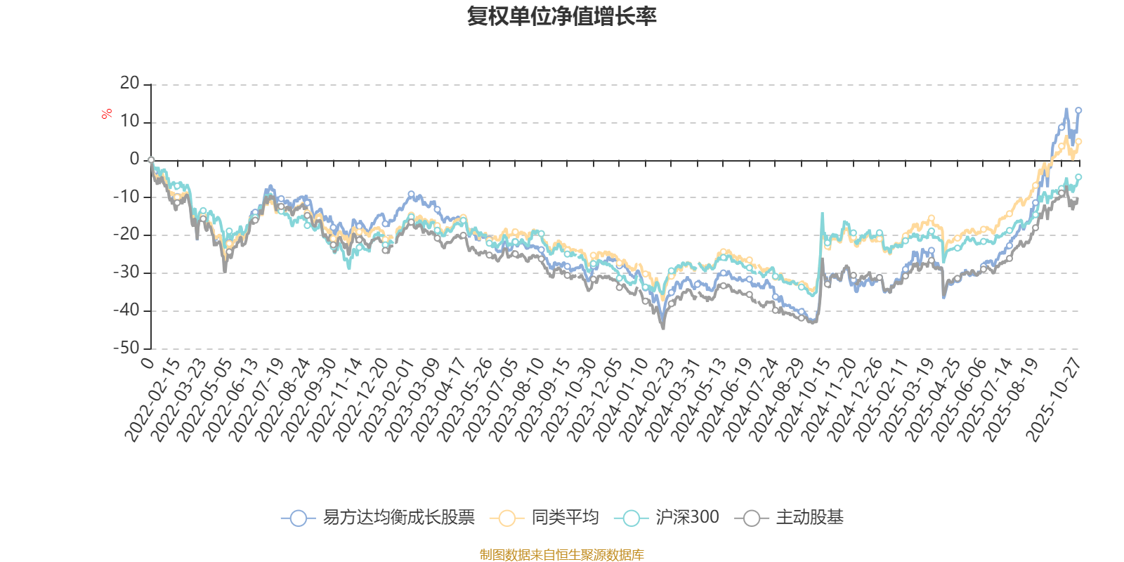 截至10月27日,易方达均衡成长股票近三个月复权单位净值增长率为39.57%,位于同类可比基金5/58;近半年复权单位净值增长率为65.64%,位于同类可比基金4/57;近一年复权单位净值增长率为63.31%,位于同类可比基金3/57;近三年复权单位净值增长率为41.31%,位于同类可比基金20/56。