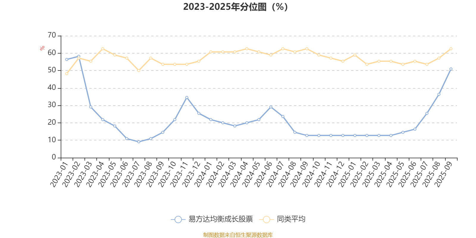 通过所选区间该基金净值增长率分位图,可以观察该基金与同类基金业绩比较情况。图为坐标原点到区间内某时点的净值增长率在同类基金中的分位数。