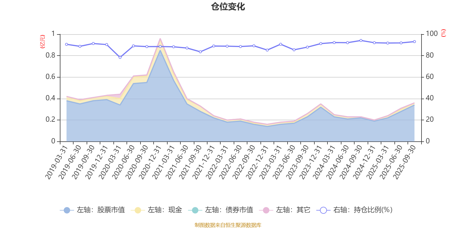 据定期报告数据统计,近三年平均股票仓位为90.65%,同类平均为86.94%。2024年三季度末基金达到94.16%的最高仓位,2020年一季度末最低,为78.36%。