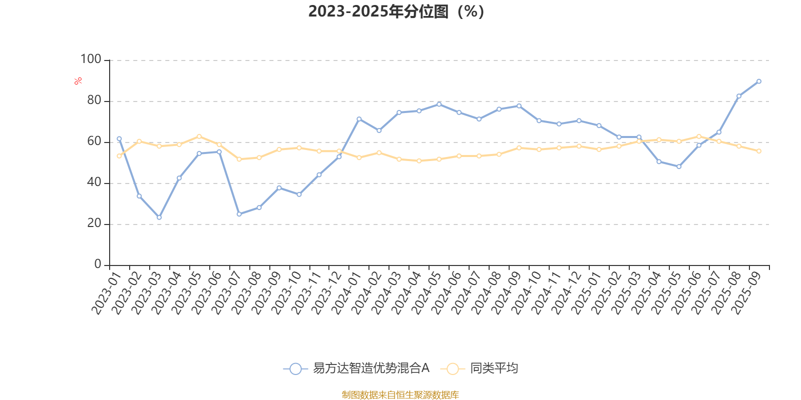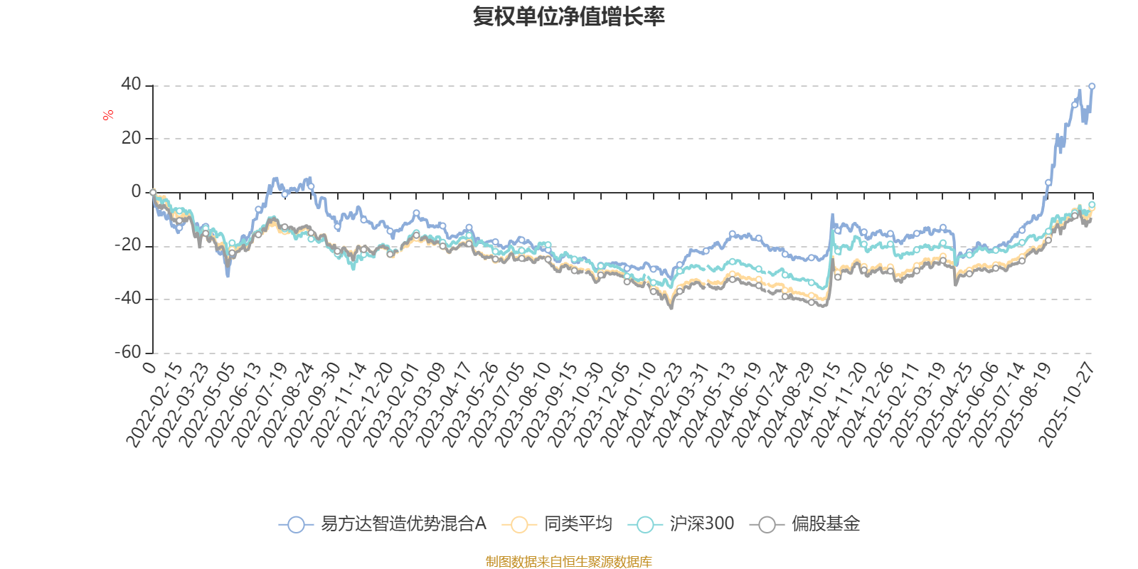 截至10月27日,易方达智造优势混合A近三个月复权单位净值增长率为56.84%,位于同类可比基金2/130;近半年复权单位净值增长率为79.59%,位于同类可比基金5/130;近一年复权单位净值增长率为58.80%,位于同类可比基金14/130;近三年复权单位净值增长率为51.44%,位于同类可比基金21/124。