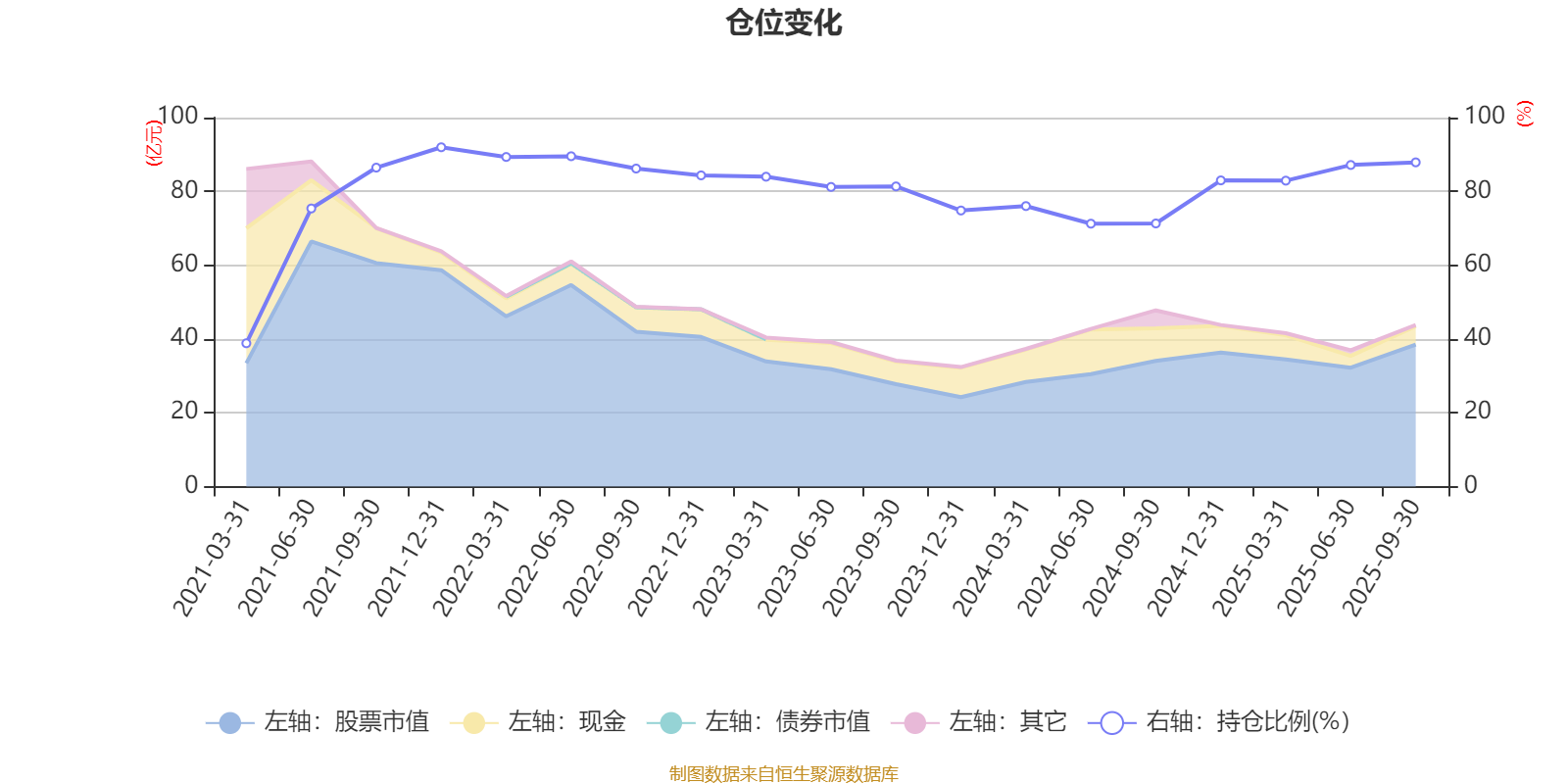 据定期报告数据统计,近三年平均股票仓位为80.43%,同类平均为86.02%。2021年末基金达到91.96%的最高仓位,2021年一季度末最低,为38.84%。