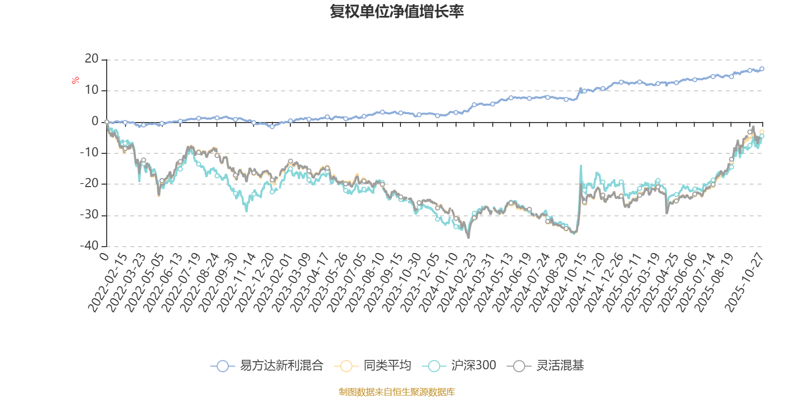 截至10月27日,易方达新利混合近三个月复权单位净值增长率为2.05%,位于同类可比基金1110/1287;近半年复权单位净值增长率为3.97%,位于同类可比基金1178/1287;近一年复权单位净值增长率为6.28%,位于同类可比基金1087/1287;近三年复权单位净值增长率为16.45%,位于同类可比基金604/1286。