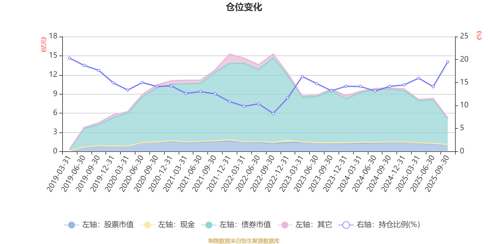 据定期报告数据统计,近三年平均股票仓位为14.63%,同类平均为72.14%。2019年一季度末基金达到20.32%的最高仓位,2022年三季度末最低,为8.26%。