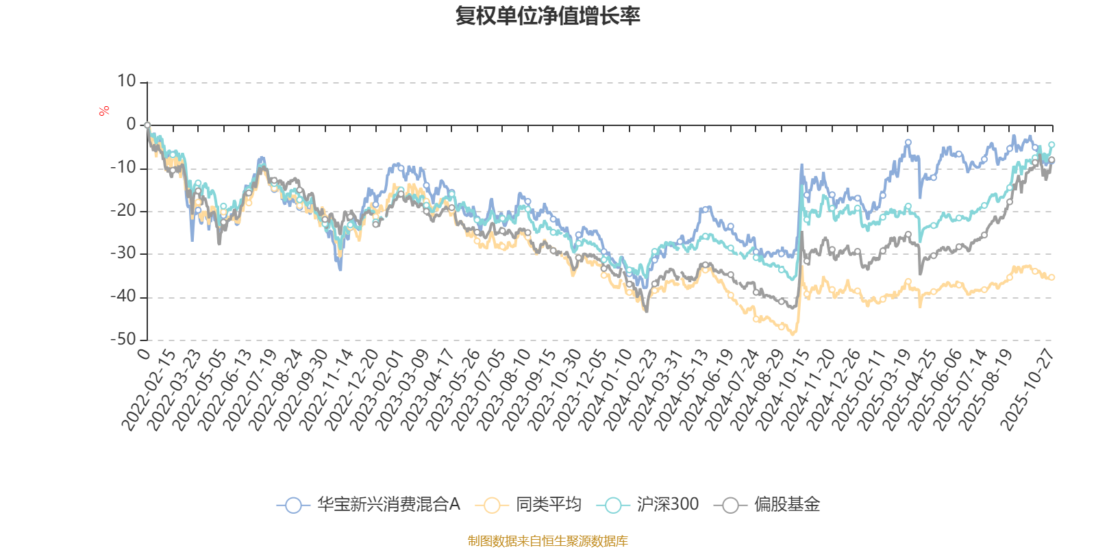 截至10月27日,华宝新兴消费混合A近三个月复权单位净值增长率为-2.99%,位于同类可比基金80/85;近半年复权单位净值增长率为4.40%,位于同类可比基金46/85;近一年复权单位净值增长率为5.63%,位于同类可比基金46/82;近三年复权单位净值增长率为34.88%,位于同类可比基金2/74。