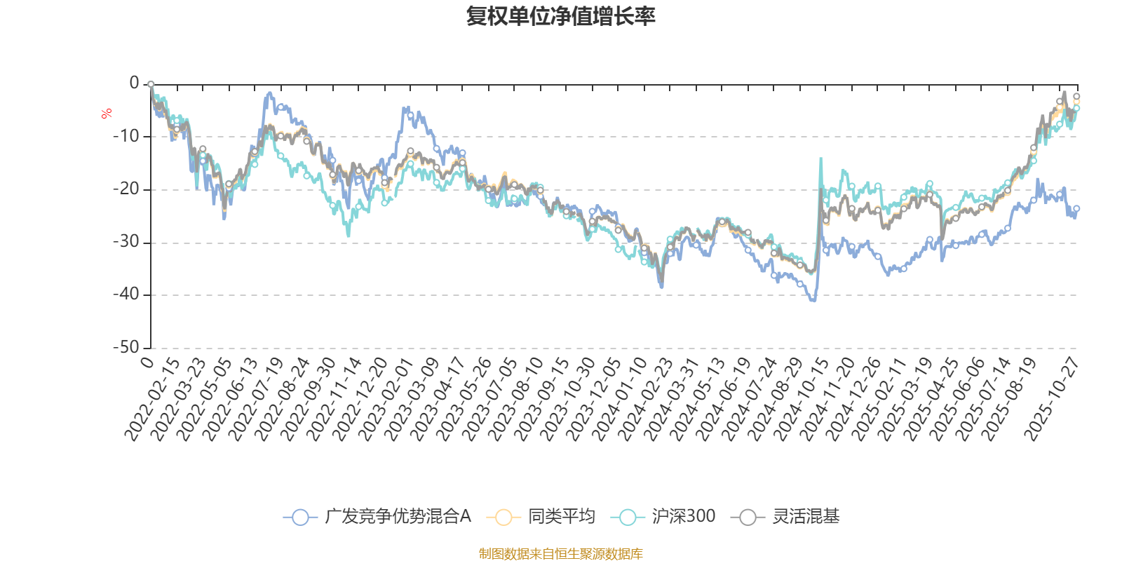 截至10月27日,广发竞争优势混合A近三个月复权单位净值增长率为0.51%,位于同类可比基金1203/1287;近半年复权单位净值增长率为10.12%,位于同类可比基金1028/1287;近一年复权单位净值增长率为10.55%,位于同类可比基金943/1287;近三年复权单位净值增长率为-1.57%,位于同类可比基金1023/1286。
