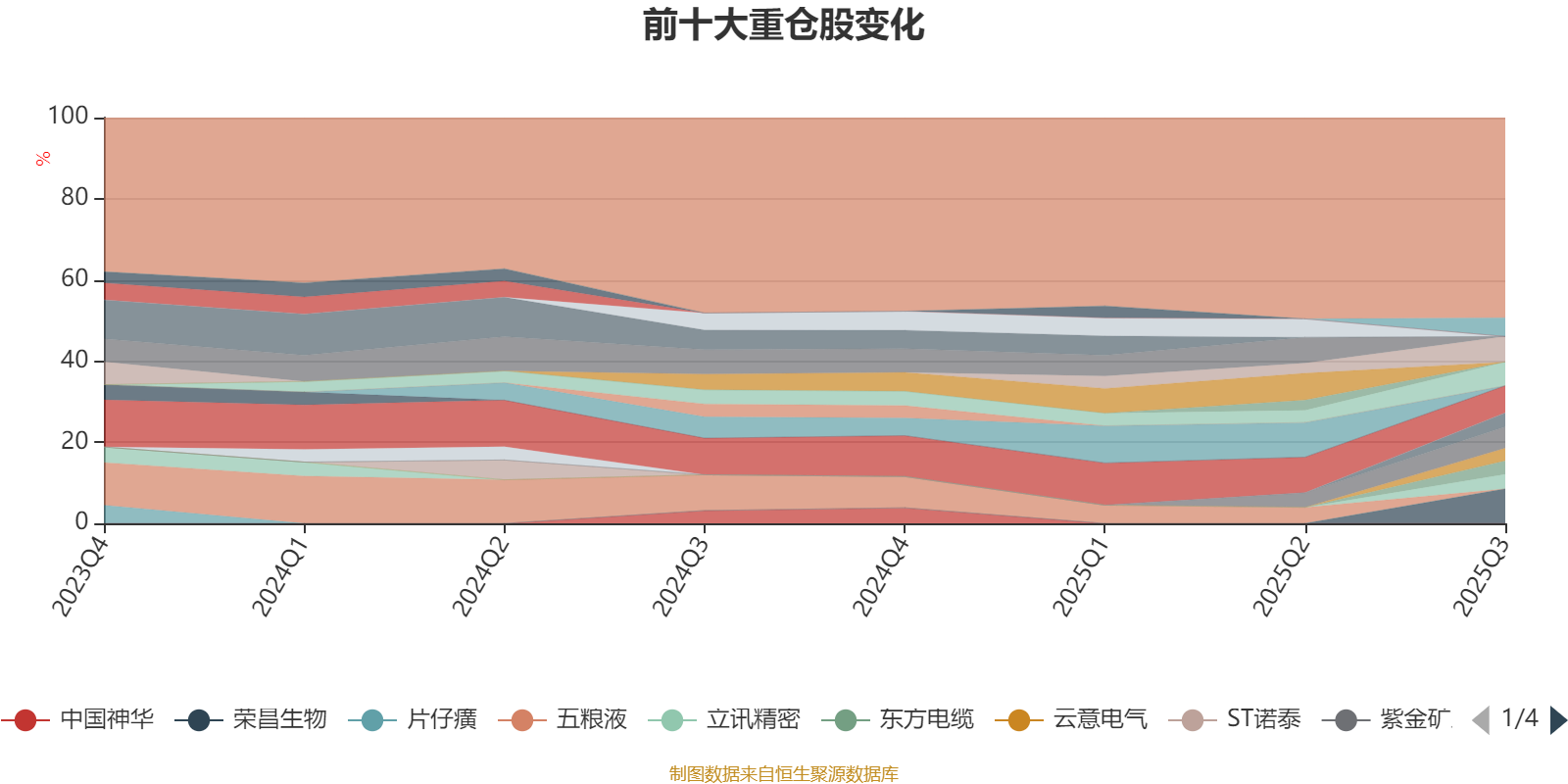 该基金持股集中度较高。截至2025年三季度末,基金十大重仓股分别是荣昌生物、贵州茅台、药明康德、宁德时代、紫金矿业、汇宇制药、立讯精密、思泉新材、东方电缆、云意电气。