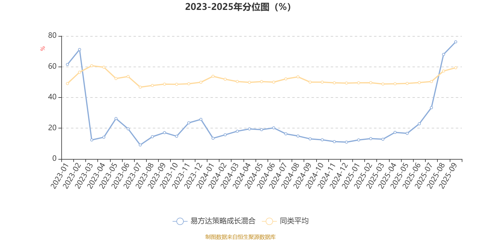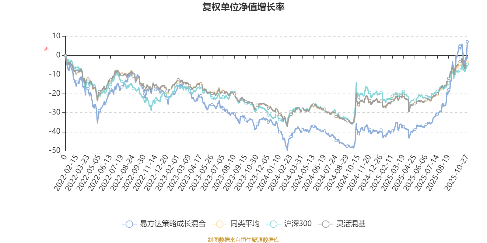 截至10月27日,易方达策略成长混合近三个月复权单位净值增长率为51.94%,位于同类可比基金43/1287;近半年复权单位净值增长率为75.40%,位于同类可比基金55/1287;近一年复权单位净值增长率为71.78%,位于同类可比基金60/1287;近三年复权单位净值增长率为29.58%,位于同类可比基金352/1286。