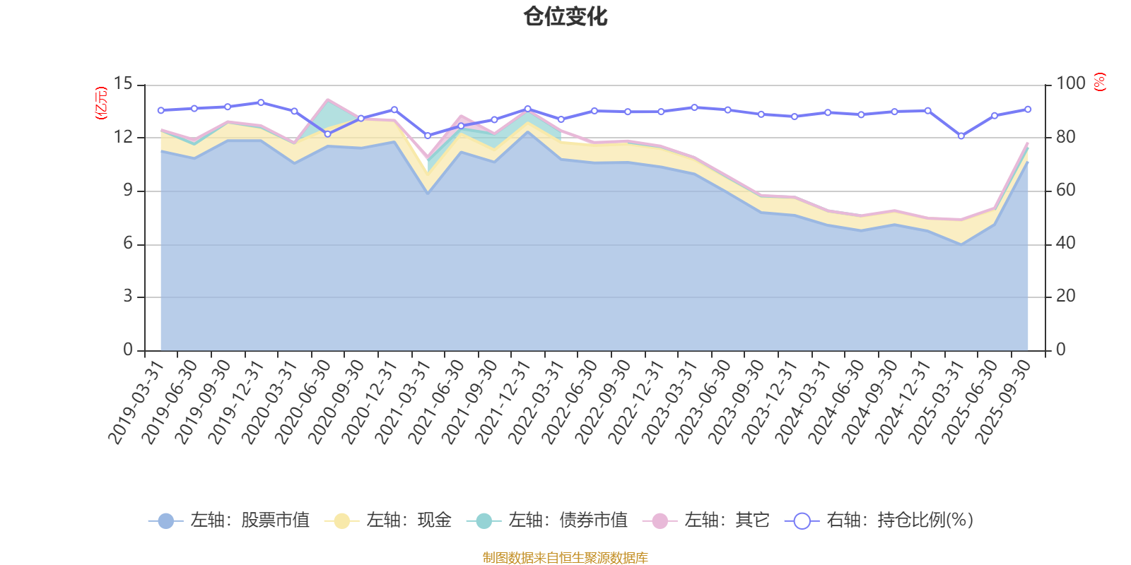 据定期报告数据统计,近三年平均股票仓位为88.93%,同类平均为72.14%。2019年末基金达到93.34%的最高仓位,2025年一季度末最低,为80.76%。