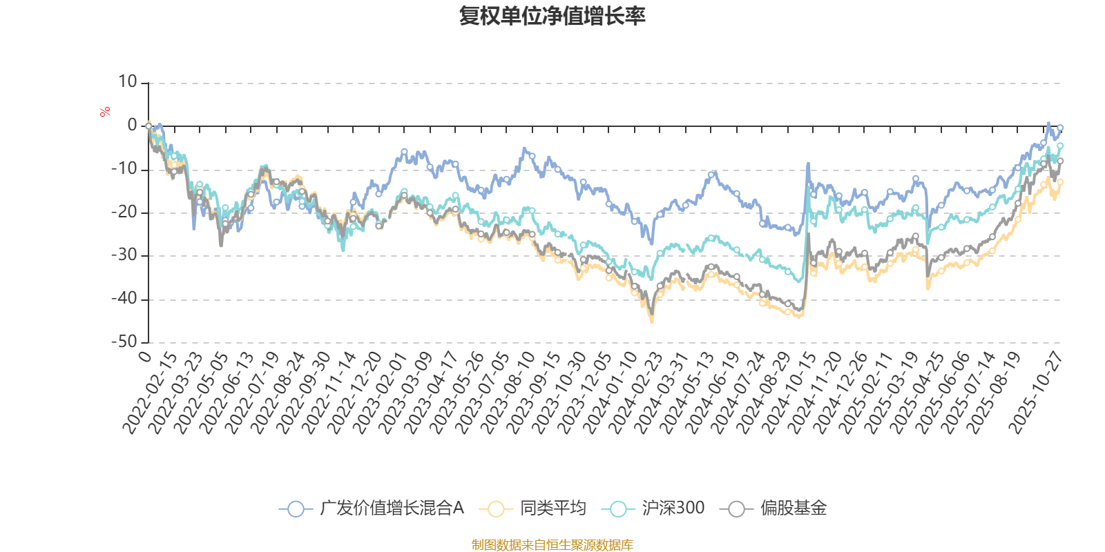 截至10月27日,广发价值增长混合A近三个月复权单位净值增长率为13.18%,位于同类可比基金112/185;近半年复权单位净值增长率为21.89%,位于同类可比基金133/185;近一年复权单位净值增长率为15.23%,位于同类可比基金150/181;近三年复权单位净值增长率为31.71%,位于同类可比基金55/175。
