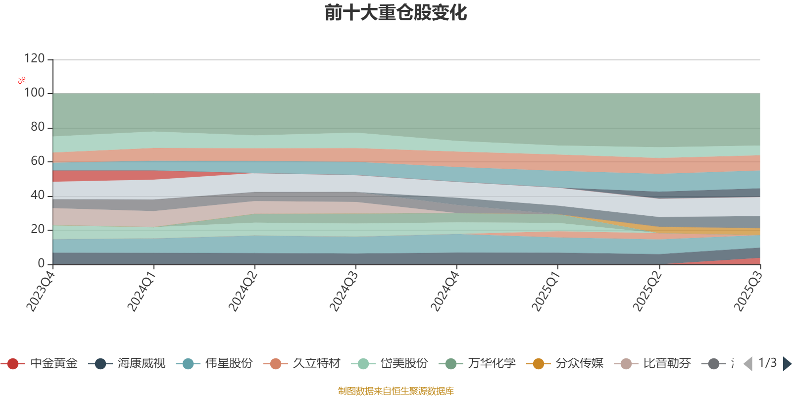 该基金持股集中度较高,近2年前十大重仓股集中度长期超过60%。截至2025年三季度末,基金十大重仓股分别是紫金矿业、腾讯控股、美的集团、伟星股份、汇丰控股、海康威视、继峰股份、杰克科技、分众传媒、中金黄金。