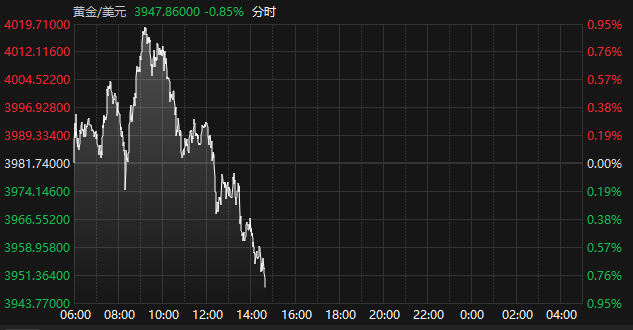 国际现货黄金午后震荡走低 跌破3950美元/盎司关口
