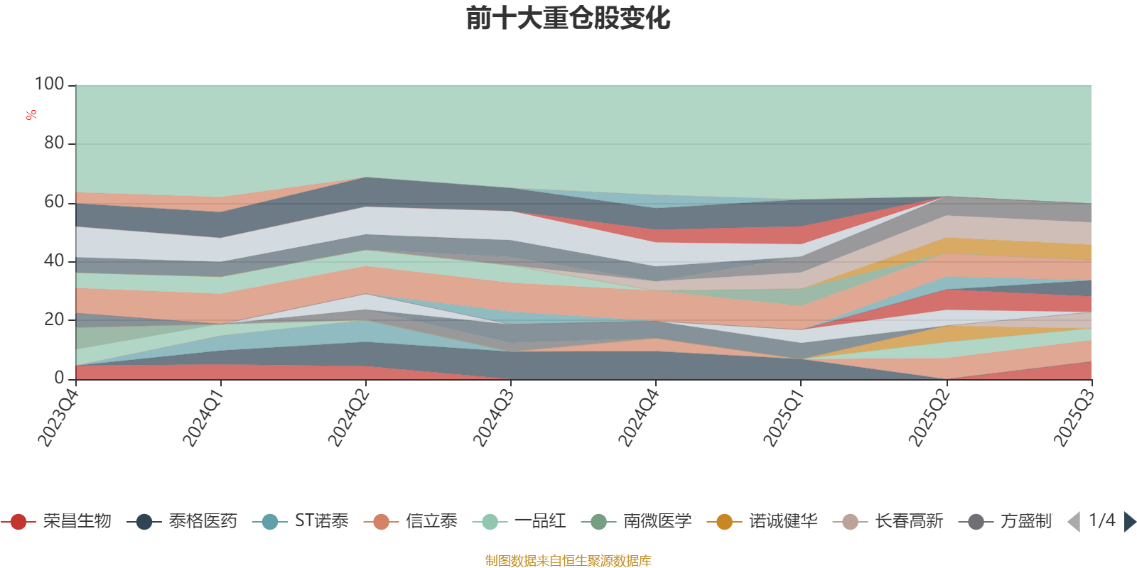 该基金持股集中度较高。截至2025年三季度末,基金十大重仓股分别是热景生物、信立泰、恒瑞医药、海思科、荣昌生物、长春高新、悦康药业、百济神州、舒泰神、一品红。