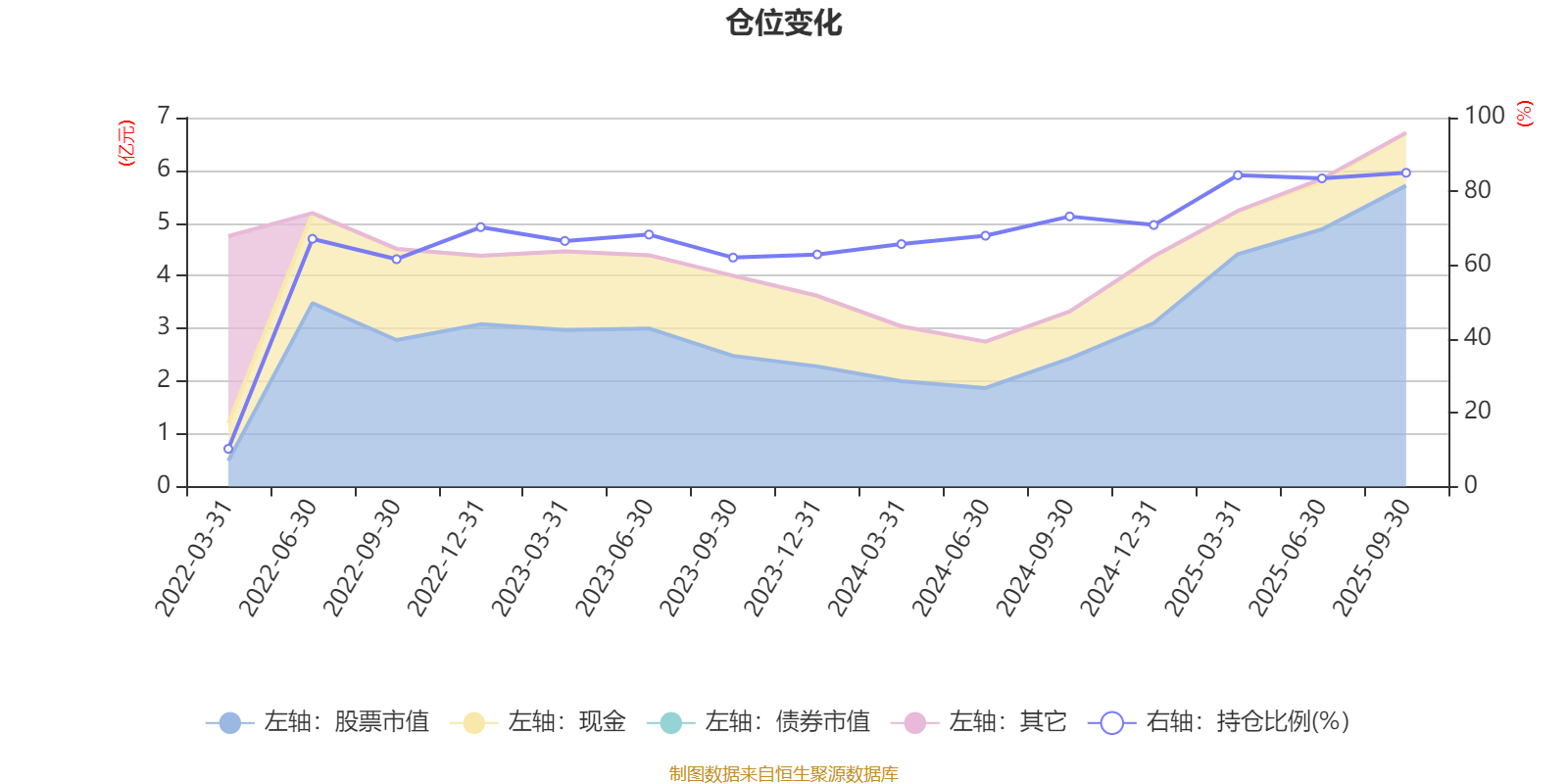 据定期报告数据统计,近三年平均股票仓位为71.74%,同类平均为85.52%。2025年三季度末基金达到85.04%的最高仓位,2022年一季度末最低,为10.23%。