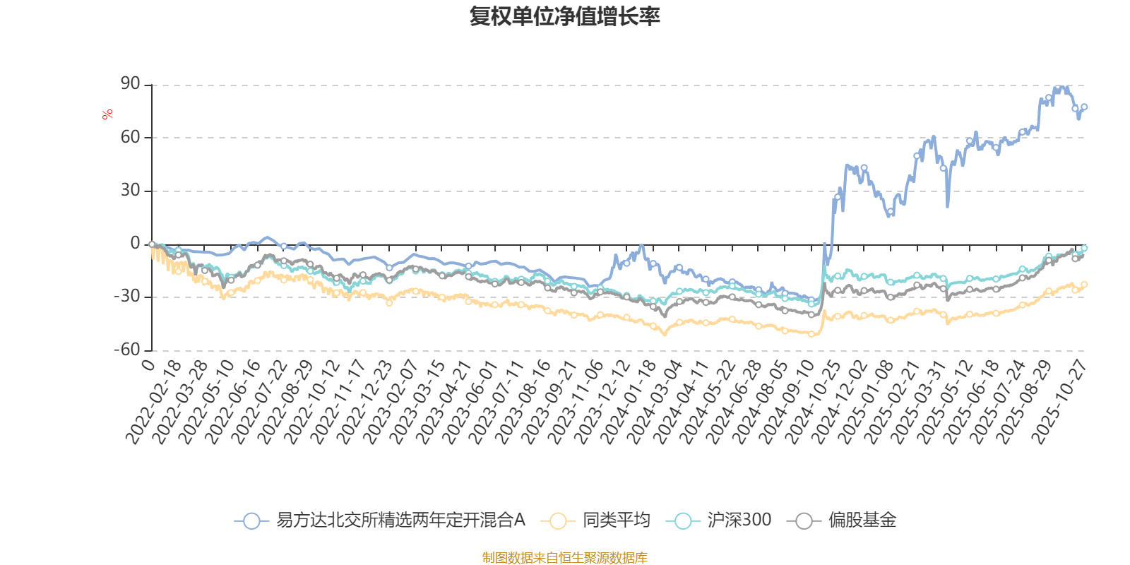 截至10月27日,易方达北交所精选两年定开混合A近三个月复权单位净值增长率为8.35%,位于同类可比基金470/621;近半年复权单位净值增长率为20.29%,位于同类可比基金471/619;近一年复权单位净值增长率为40.10%,位于同类可比基金179/611;近三年复权单位净值增长率为93.68%,位于同类可比基金12/518。