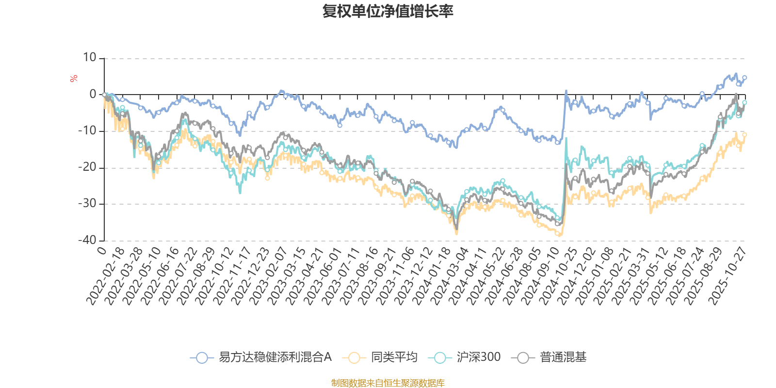 截至10月27日,易方达稳健添利混合A近三个月复权单位净值增长率为5.06%,位于同类可比基金102/134;近半年复权单位净值增长率为8.93%,位于同类可比基金119/134;近一年复权单位净值增长率为6.90%,位于同类可比基金116/130;近三年复权单位净值增长率为16.66%,位于同类可比基金66/119。