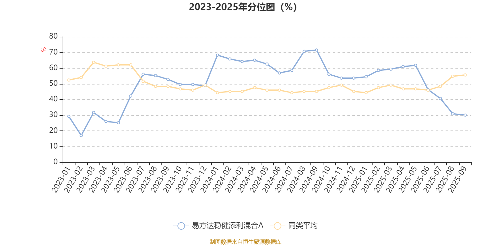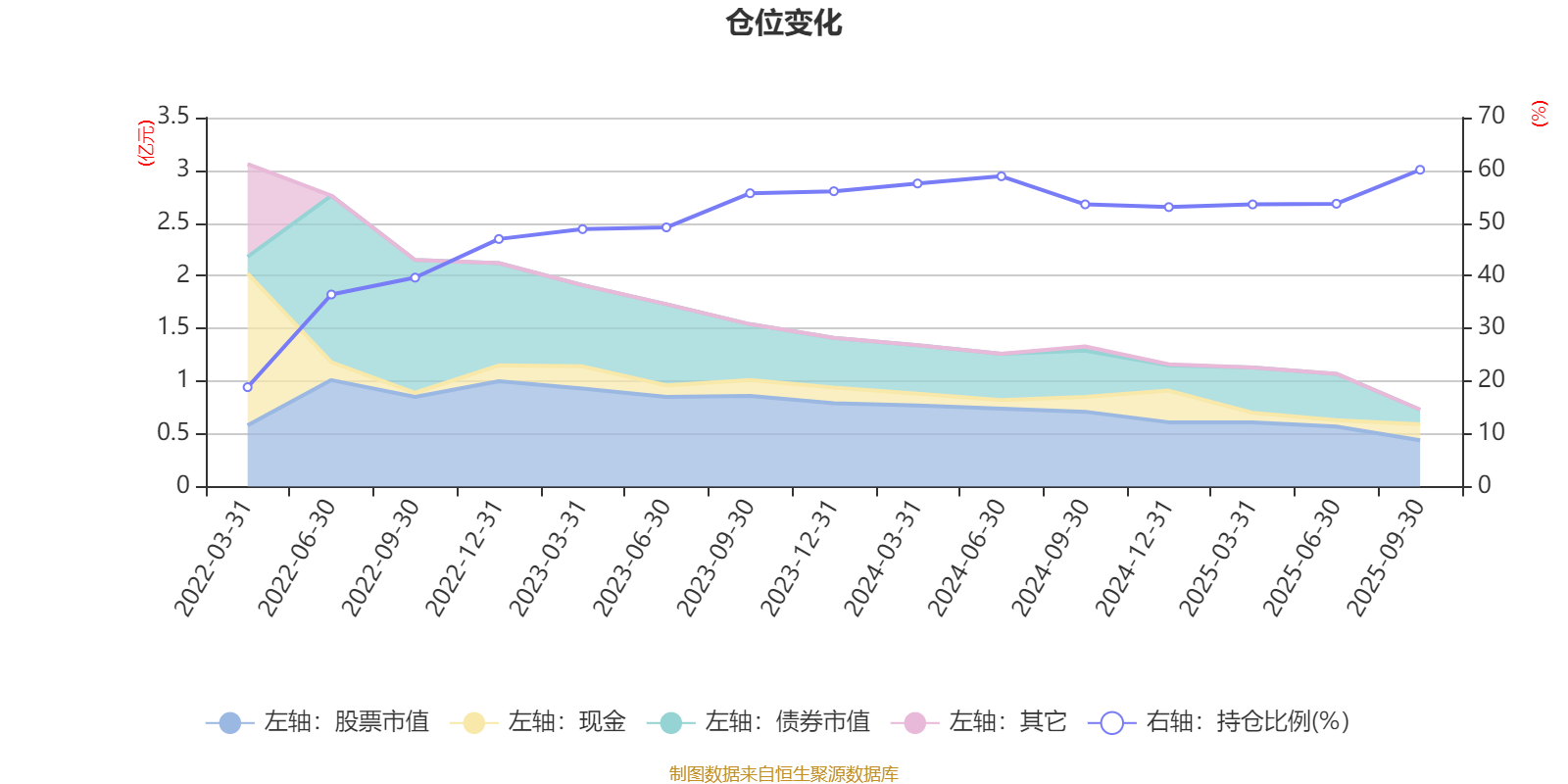 据定期报告数据统计,近三年平均股票仓位为53.91%,同类平均为67.21%。2025年三季度末基金达到60.1%的最高仓位,2022年一季度末最低,为18.86%。