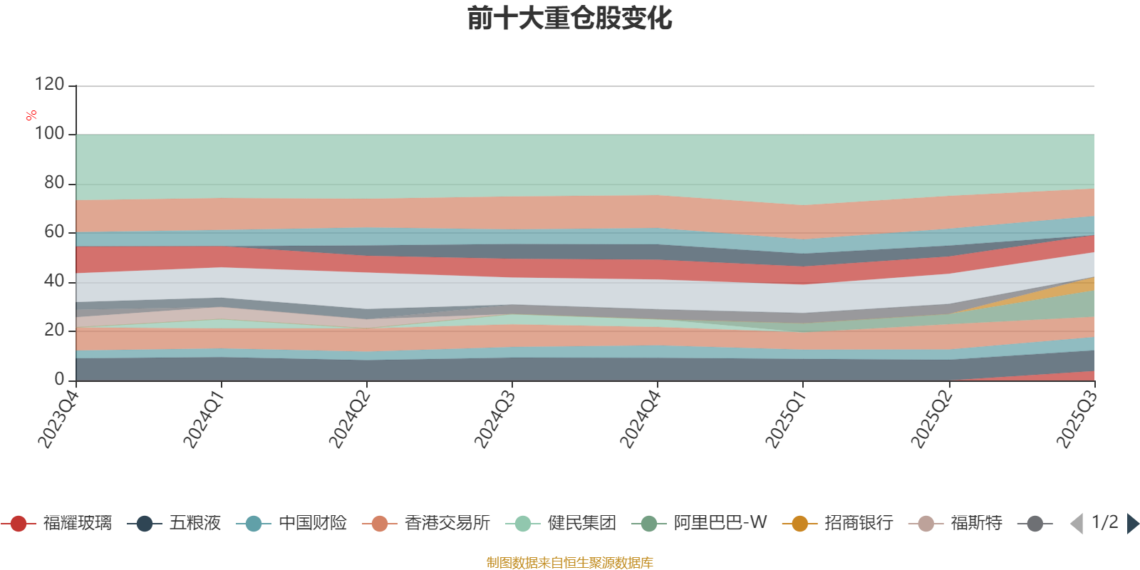 该基金持股集中度较高,且持股标的较为稳定,近2年前十大重仓股集中度长期超过60%。截至2025年三季度末,基金十大重仓股分别是贵州茅台、阿里巴巴-W、腾讯控股、五粮液、香港交易所、宝丰能源、美的集团、招商银行、中国财险、福耀玻璃。