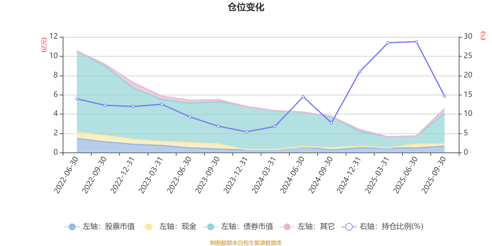 据定期报告数据统计,近三年平均股票仓位为14%,同类平均为19.14%。2025年上半年末基金达到28.76%的最高仓位,2023年末最低,为5.41%。